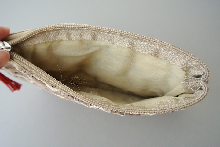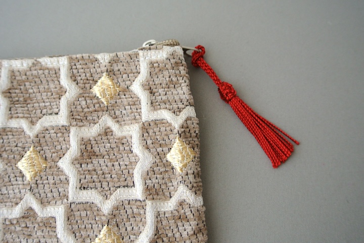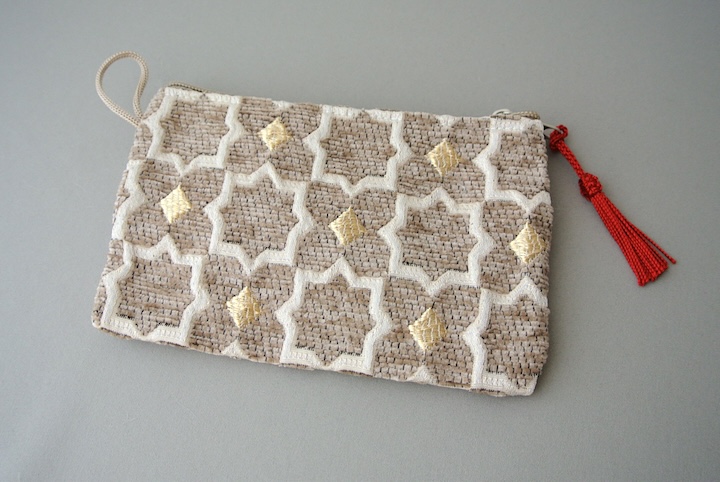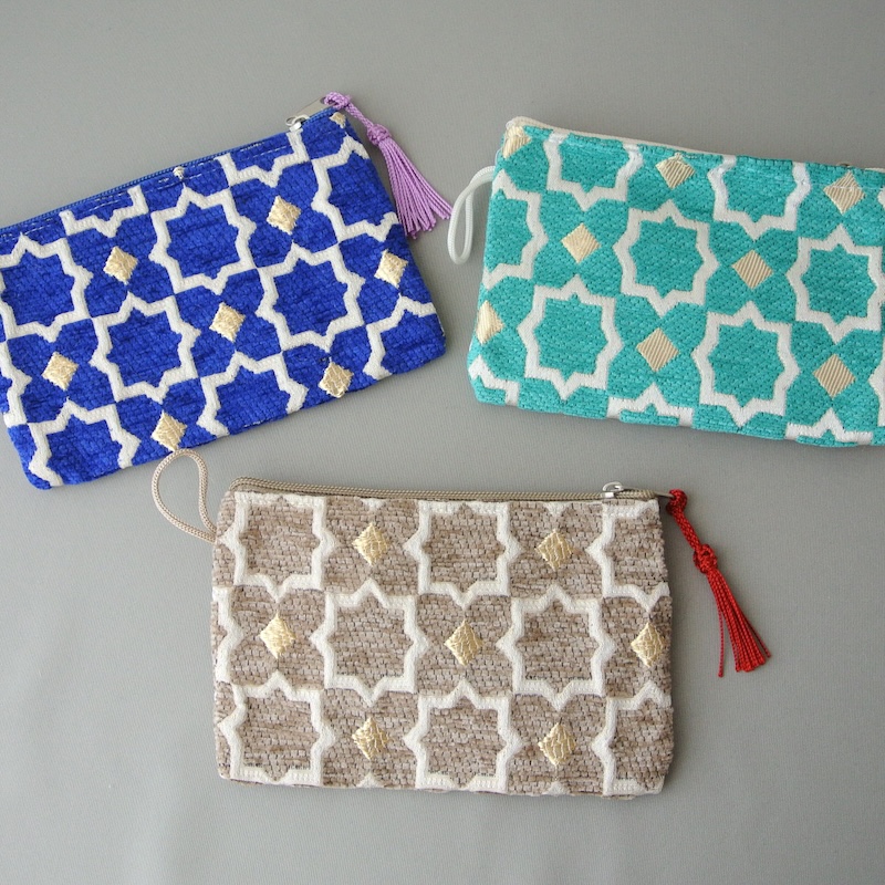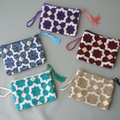 モロッコの高級布”モッブラ”のハギレで使ったポーチ。