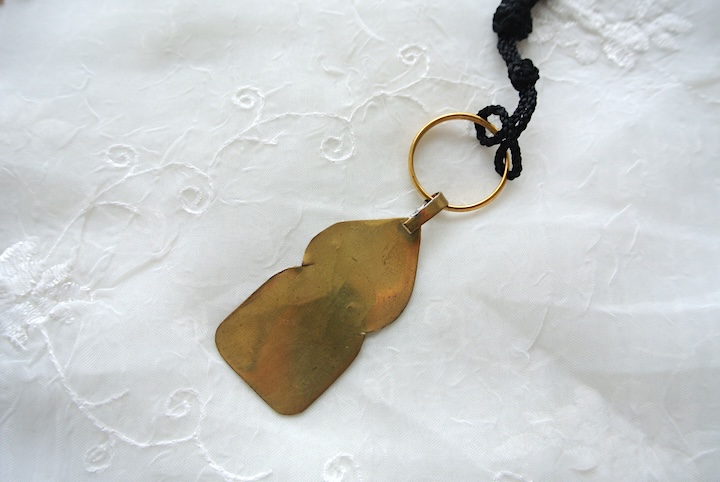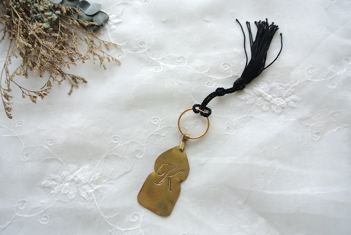 真鍮製のモスク型プレートにイニシャルが入ったキーホルダー。
